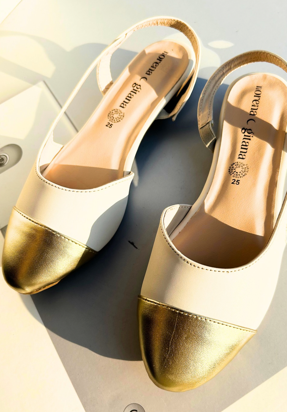 Descripción: Mules de punta redonda en colores hueso + dorado. Con correa para sujetar